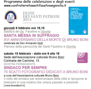 In occasione del 16° anniversario della scomparsa di Bruno Boni l'Associazione ha chiesto ed ottenuto dalla Confraternita dei Santi Faustino e Giovita di inserire, nel calendario delle manifestazioni per la Festa dei Santi patroni della Città di Brescia, l'appuntamento del 15 febbraio con la Mostra fotografica "Sindaco per sempre" allestita nella sede di Contrada del Carmine. Il 6 febbraio alle 18,15 la Santa Messa di commemorazione in San Faustino celebrata da Don Armando Nolli.